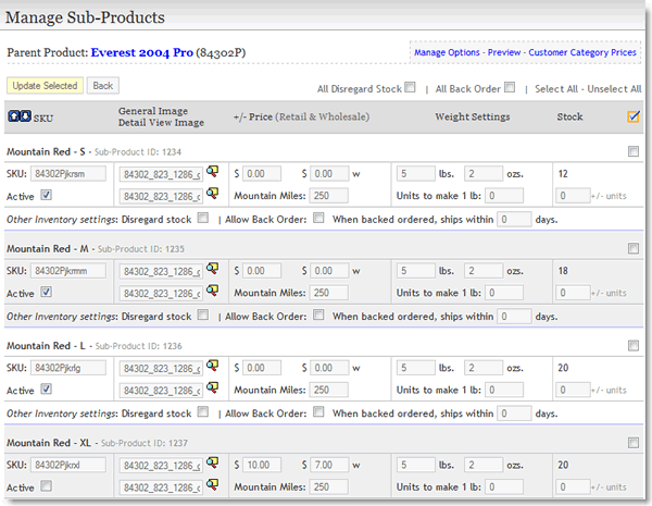 Here is an example of a "Manage Sub-Products" page, so you can get a visual idea of which product properties can be set at the sub-product level.